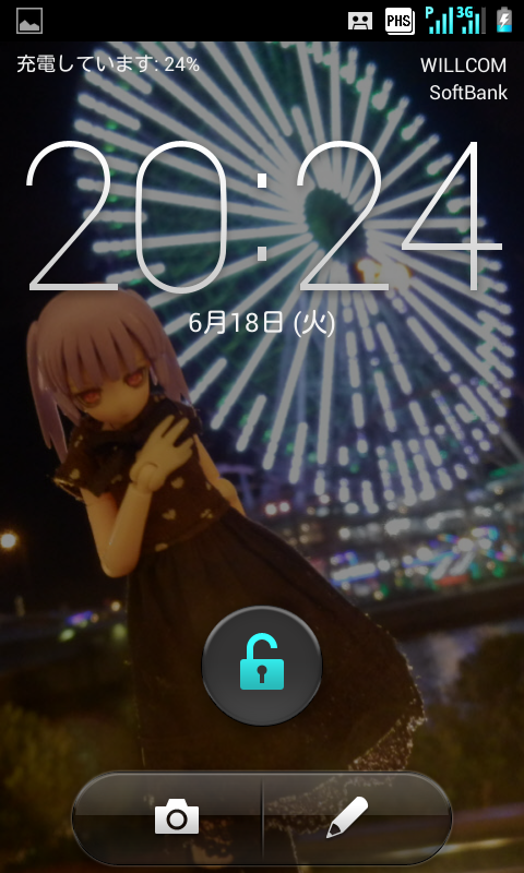 この機種の最大の特徴、それは右のロック画面を見ても分かるようにウィルコムとソフトバンクの両方の回線が入っているということ。