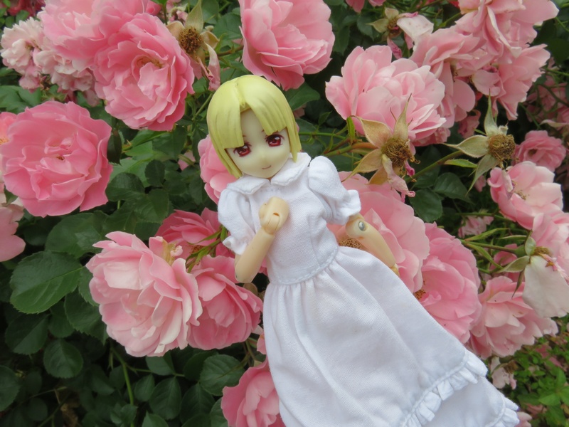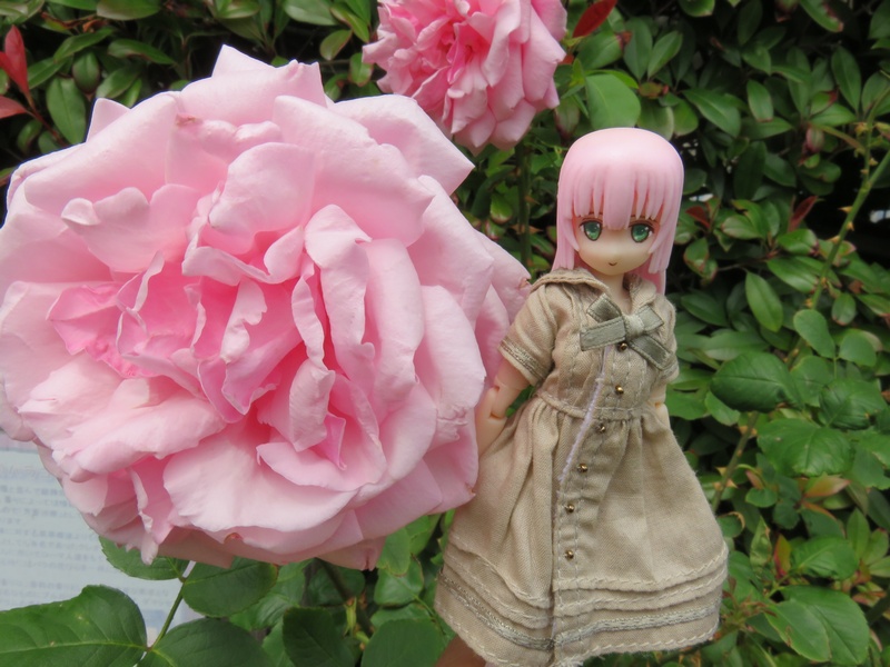 本人の髪と同じピンク色のバラと一緒に。