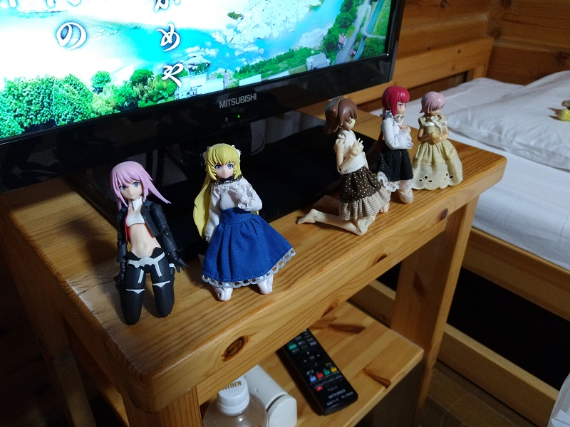 左からうちのfigma夜露ちゃん、KARUPAさんちのマドレーヌちゃん、吹雪さんちのクフィルちゃんと緋炎ちゃん、KARUPAさんちの那緒ちゃん。