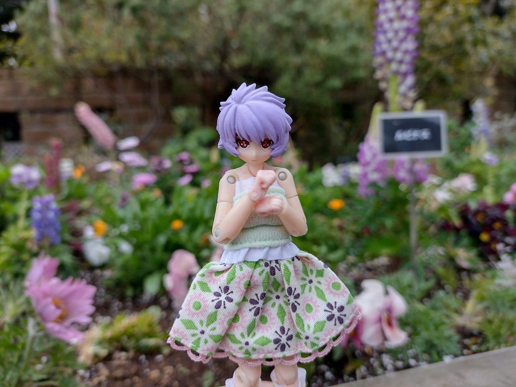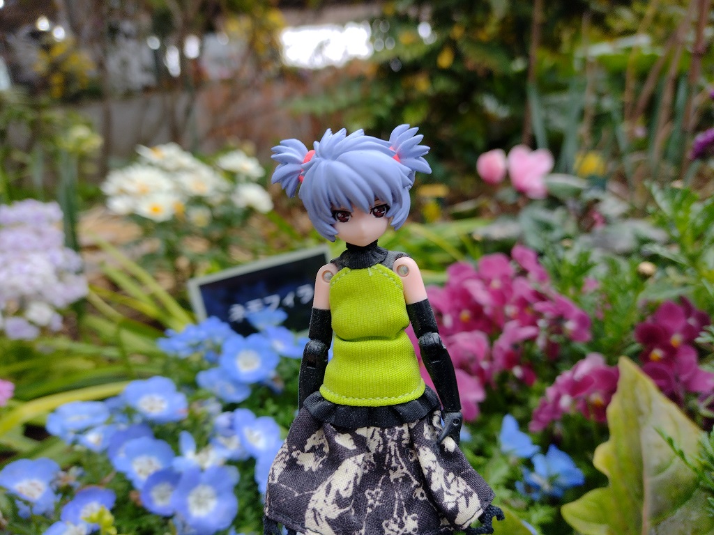 ネモフィラの前でネモフィラちゃん。